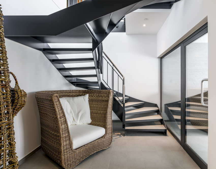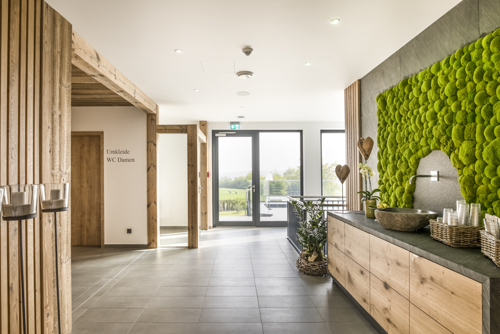 Tagesgäste gelangen in das Gebäude über den großzügig angelegten Hauptzugang im Erdgeschoss. Der für die Hausgäste bestimmte Wellnessbereich ist für sie über einen unterirdischen „Bademantelgang“ zugänglich, der sich durch eine elegante Sichtbetonoptik auszeichnet.