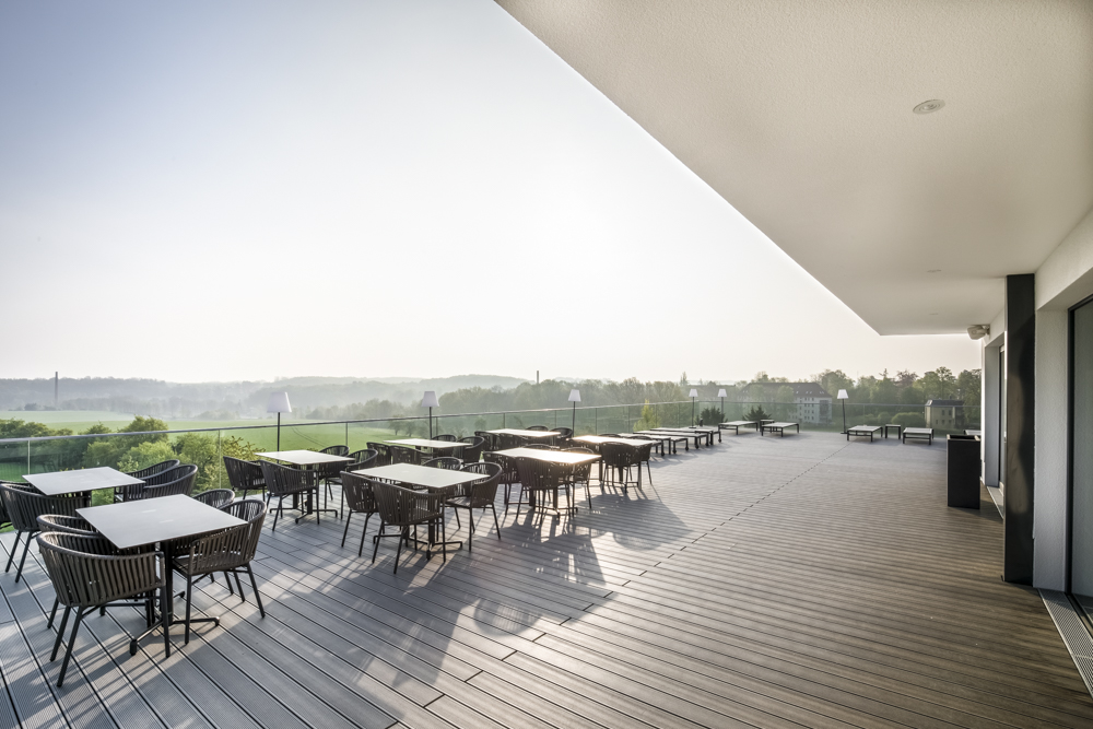 Die groß angelegte Dachterrasse, die über eine gemütliche Bar verfügt, bietet einen fantastischen Blick über das Land am Fuße des Erzgebirges.
