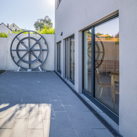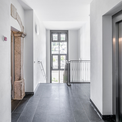 Dem öffentlichen Charakter des Gebäudes Rechnung tragend, wurde dem Gebäude ein moderner und in der Gestaltung kontrastierender Anbau zur Aufnahme der barrierefreien vertikalen Erschließung mittels modernen Personenaufzugs hinzugefügt.